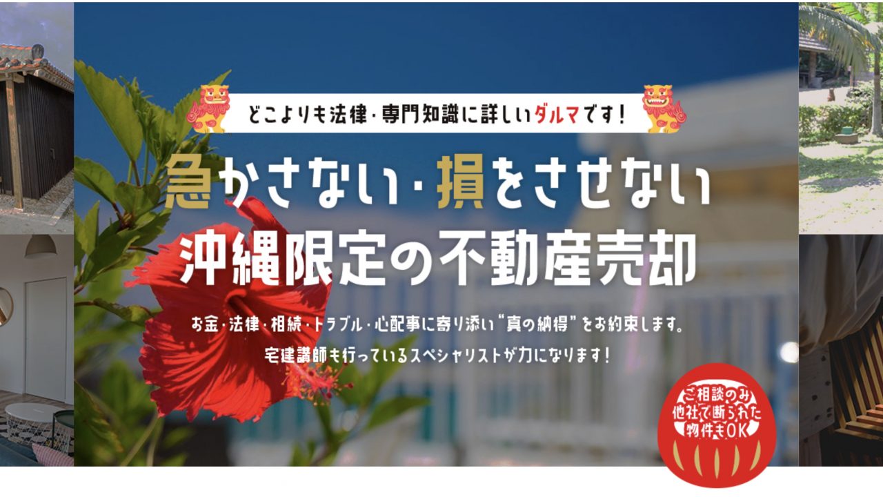 那覇市で不動産売買や不動産賃貸のことなら、土地・建物のスペシャリストがお金・法律・相続・トラブル・心配事などに寄り添ったサポートを行っている株式会社ダルマにご相談ください。